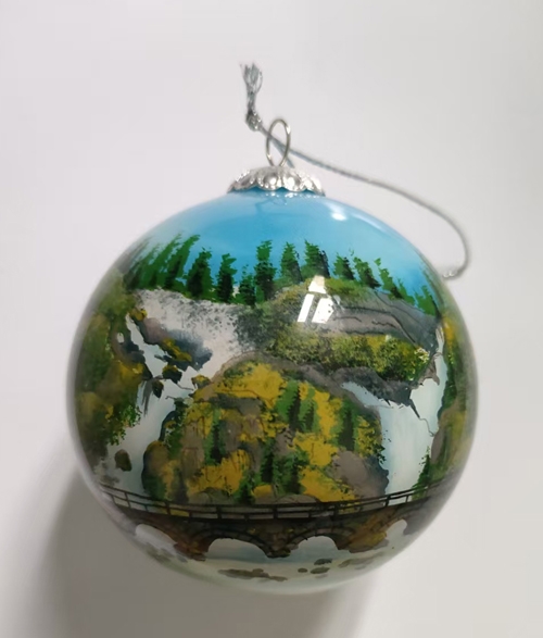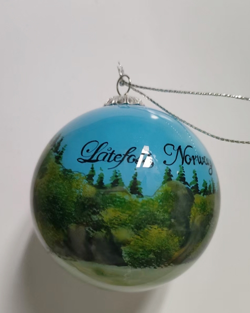 Håndmalt julekule med sommermotiv fra Låtefoss